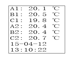1.裝置通電開(kāi)機(jī)后液晶屏顯示如下界面,時(shí)鐘逐秒跳動(dòng)表示裝置正在運(yùn)行。如果顯示的并不是當(dāng)前日期和時(shí)間,請(qǐng)參考下面提及的步驟進(jìn)行設(shè)置。裝置開(kāi)機(jī)界面顯示2路溫濕度實(shí)時(shí)值和觸點(diǎn)測(cè)溫?cái)?shù)據(jù)如下圖所示: